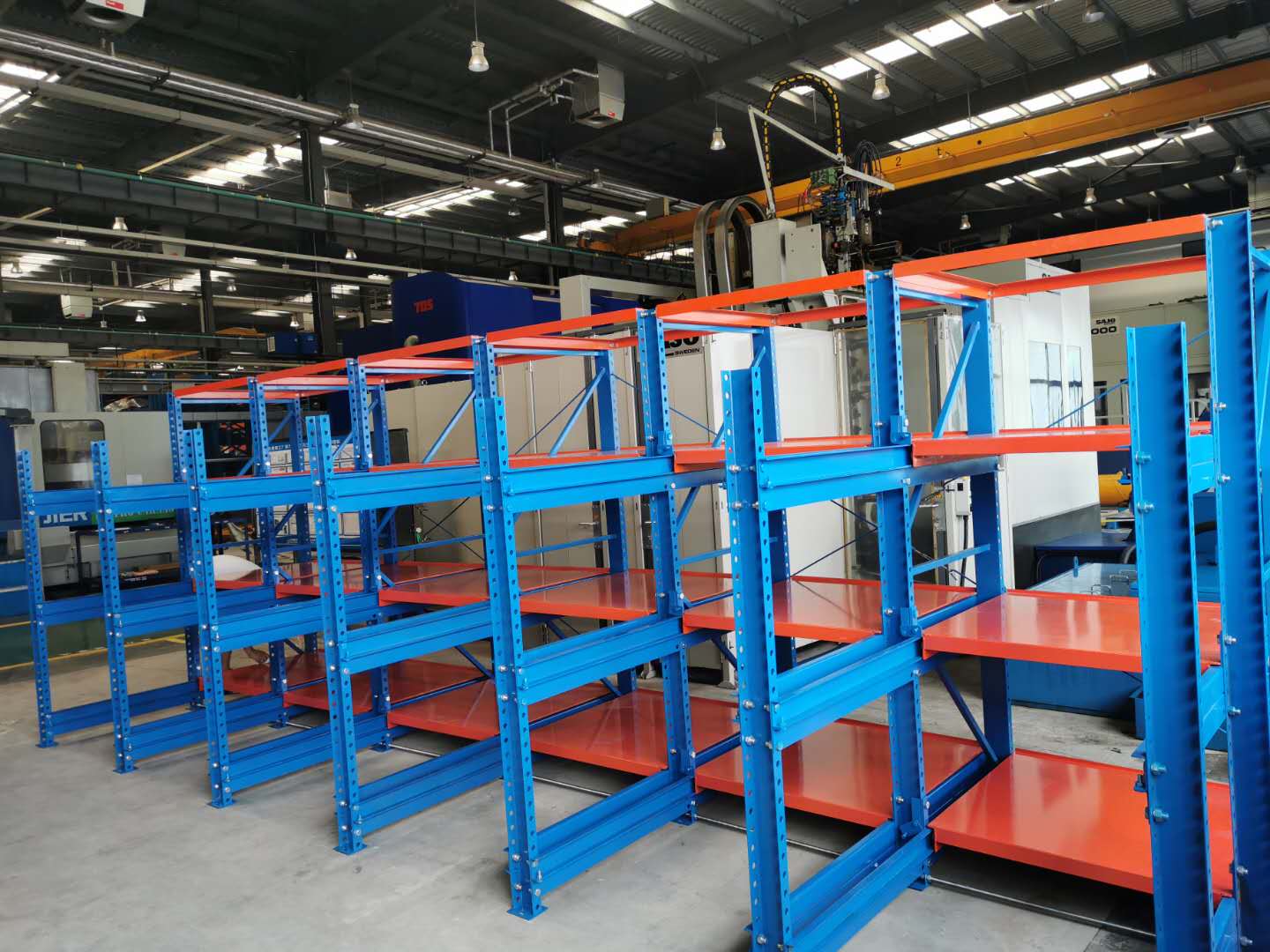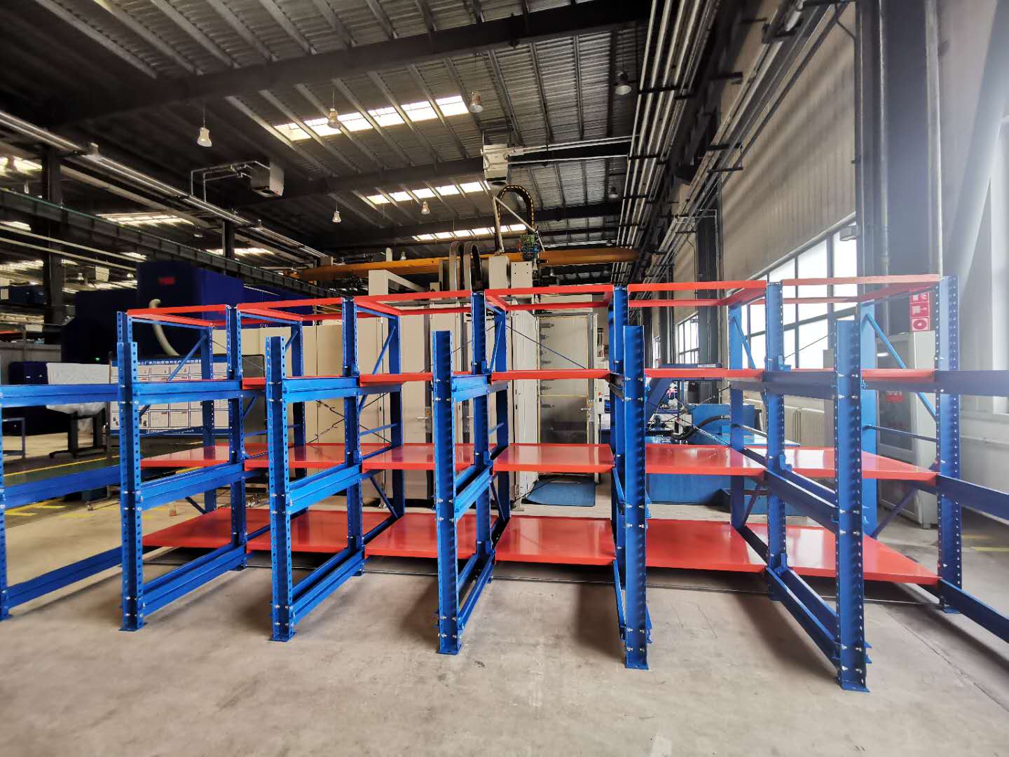 上圖是我司給沈陽一家公司生產(chǎn)定制模具貨架,模具架規(guī)格:L5700*D2600*H2090 數(shù)量一排、層數(shù)為3層加固定板 每層載重1000KG,可抽屜1300MM,立柱10#槽鋼,滑槽4.0+3.0厚度,面板1.5mm 抽屜板可按50倍數(shù)調(diào)節(jié)層高 顏色:立柱藍色/抽板桔紅色 噴涂 酸洗 磷化 防靜電噴涂