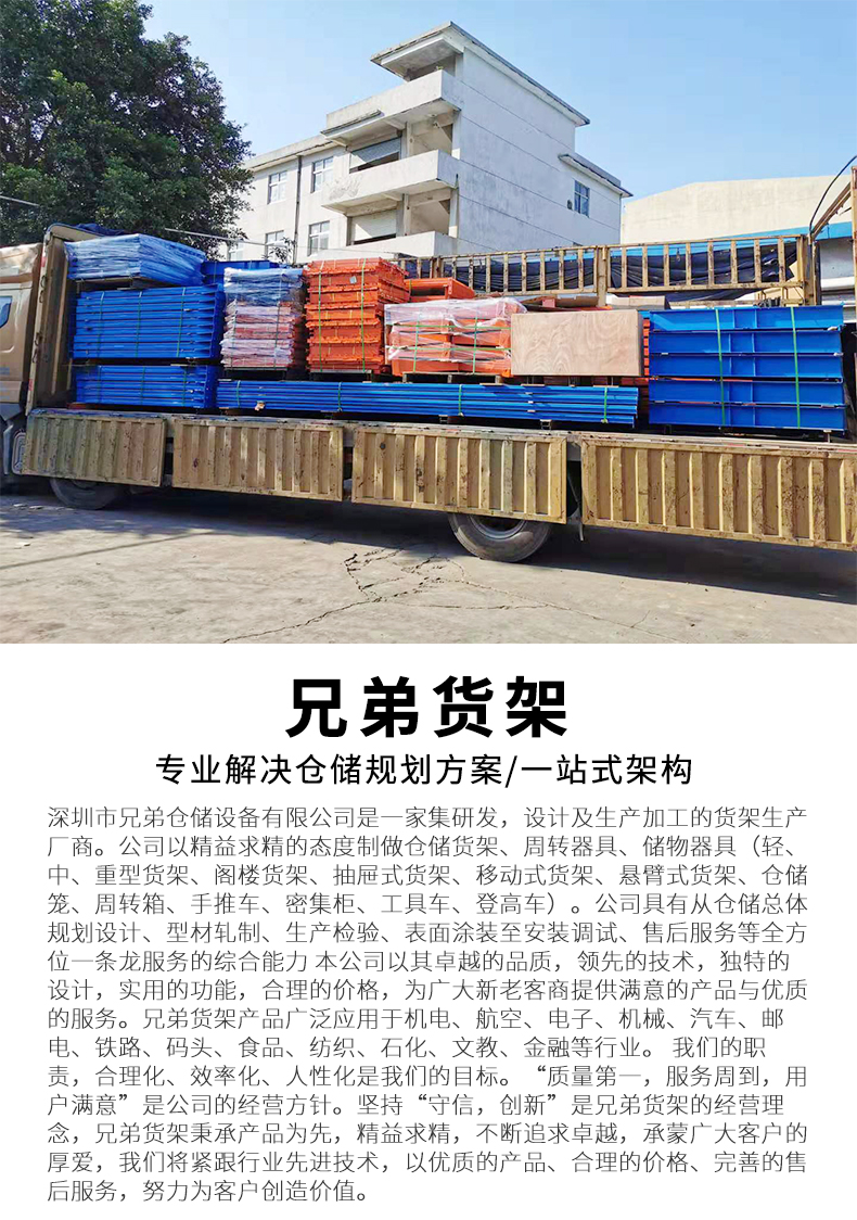 深圳兄弟倉儲貨架專業(yè)生產(chǎn)重型貨架,懸臂架,閣樓式貨架,輕中型貨架,模具貨架.根據(jù)客戶的需求點出發(fā)幫客戶解決貨架選款,貨架尺寸,貨架 承重,貨架定制等問題,免費上門測量CAD方案,是一個貼心,省心,價格實惠的貨架廠家,在線客服或電話:18126304965 微信同步 我們隨時為您服務! 五年質保服務,保修期內(nèi)因產(chǎn)品本身質量問題,承諾免費維修或更換